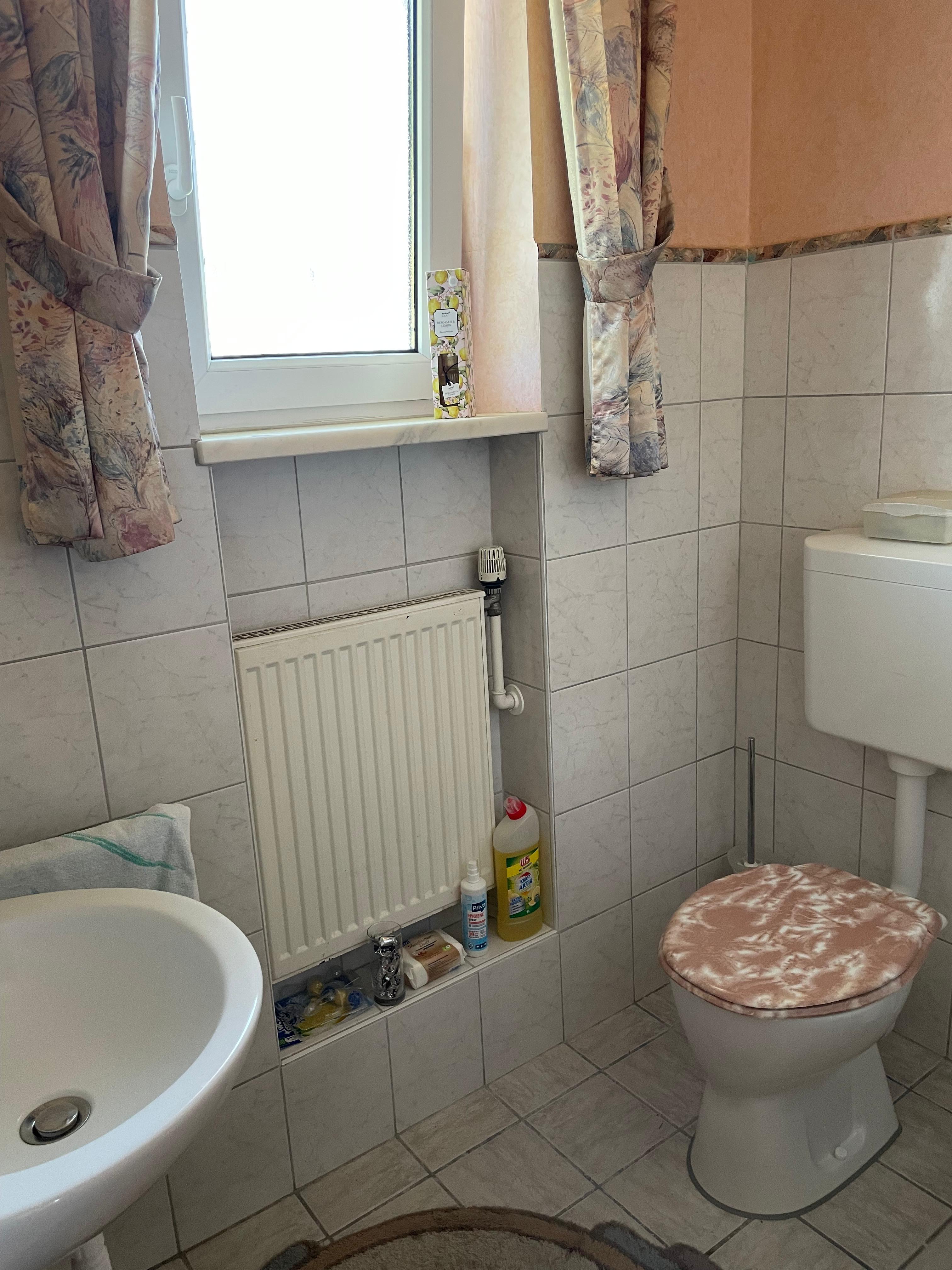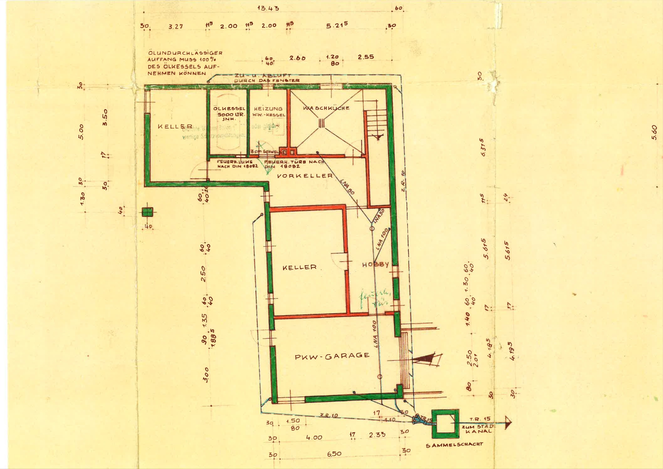 Dieser massiv gebaute Winkelbungalow teilt sich im Erdgeschoss in ein Wohn-Esszimmer, eine Küche mit Speisekammer, einer Diele mit Garderobe und Gäste-WC, zwei Kinderzimmer, einem Elternschlafzimmer und einem Vollbad auf.Zudem ist der Bungalow komplett unterkellert. Dort sind mehrere Kellerräume die als Staumöglichkeiten oder Hobbyräume genutzt werden können. Außerdem ist der Heizraum, ein Waschraum und auch die Garage dort zu finden.
