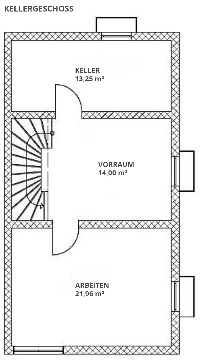 Die Doppelhaushälfte hat ein Kellergeschoss mit einem Technikraum, einen großen Vorraum und einen Raum mit einem Tageslichtfenster für die individuelle Nutzung.