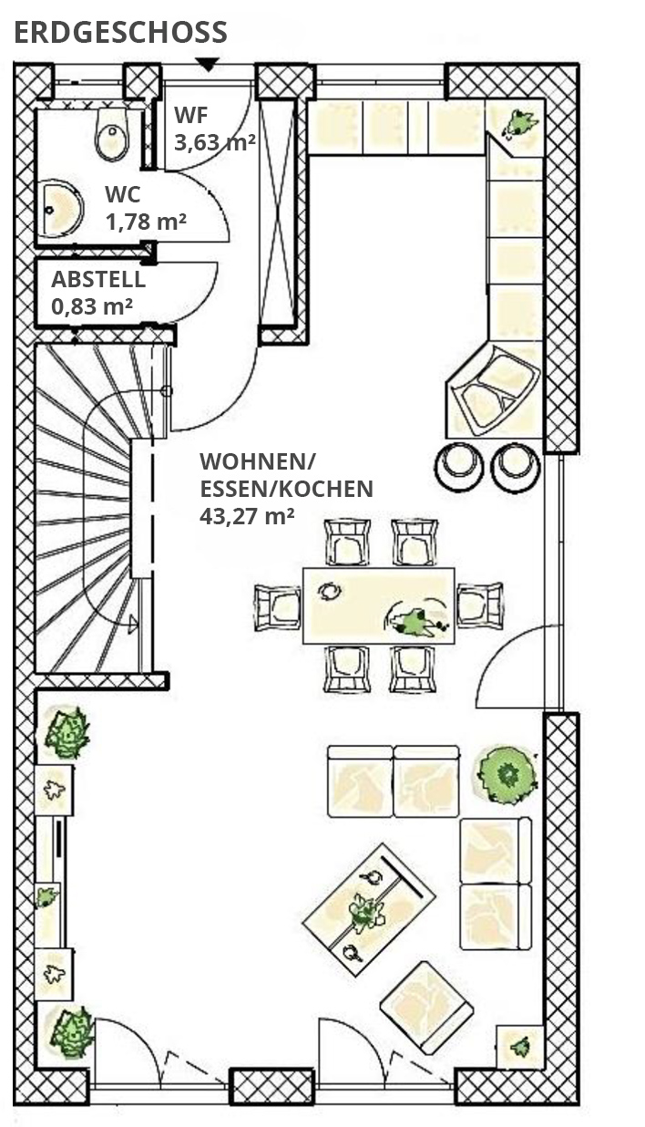 Die Wohnfläche unterteilt sich in Erd- sowie Dachgeschoss und besticht durch großzügige Räumlichkeiten. Das Erdgeschoss teilt sich auf in einen großen, lichtdurchfluteten Wohn-Ess-Kochbereich mit Zugang zur ca. 25 m² großen, gepflasterten Terrasse, wo Sie gemütliche Sommerabende verbringen können. Ebenfalls gibt es ein Gäste-WC sowie ein kleiner Abstellraum.