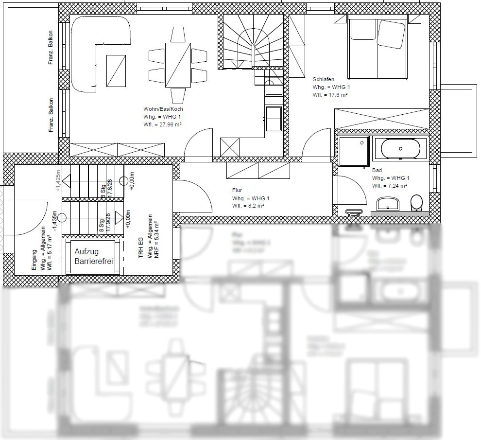 Dieses Mehrfamilienhaus entsteht in Lappersdorf-Kareth. Es ist in 6 Wohneinheiten aufgeteilt, die sich auf drei Etagen plus Keller verteilen. Das Gebäude wird als Energieeffizienz KFW 40 mit QNG ausgeführt. Die Erdgeschosswohnungen verfügen über einen Zugang zu weiteren Räumen im Untergeschoss.Jede Wohnung erhält eine Lüftungsanlage mit Wärmetauscher. Die Ausstattung der Wohnung ist sehr hochwertig gewählt.