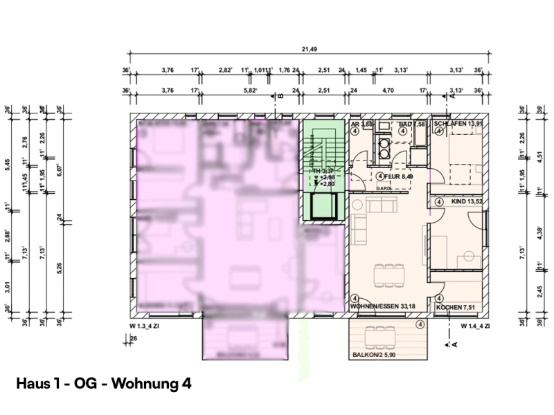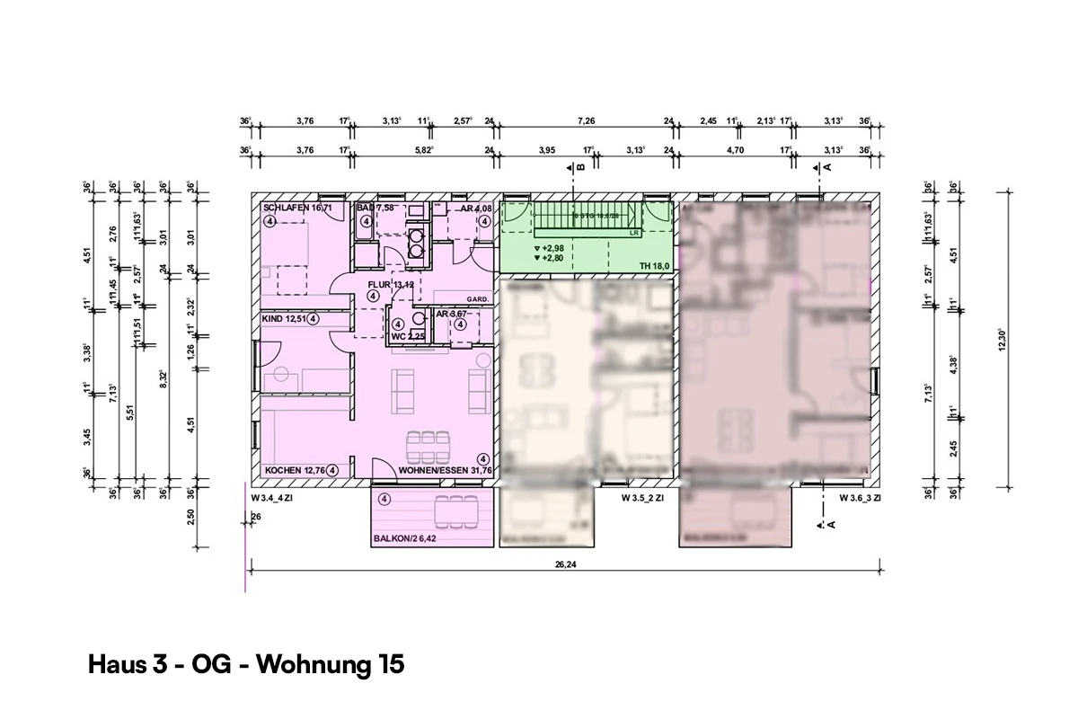 | Haus 1 – Wohung Obergeschoss 4 | Etage: 2 | Wohnfläche: ca. 93,97 m² (3 Zimmer) | Balkon vorhanden: Ja | Stellplatztyp: Carport, Aussenstellplatz | frei! | |
