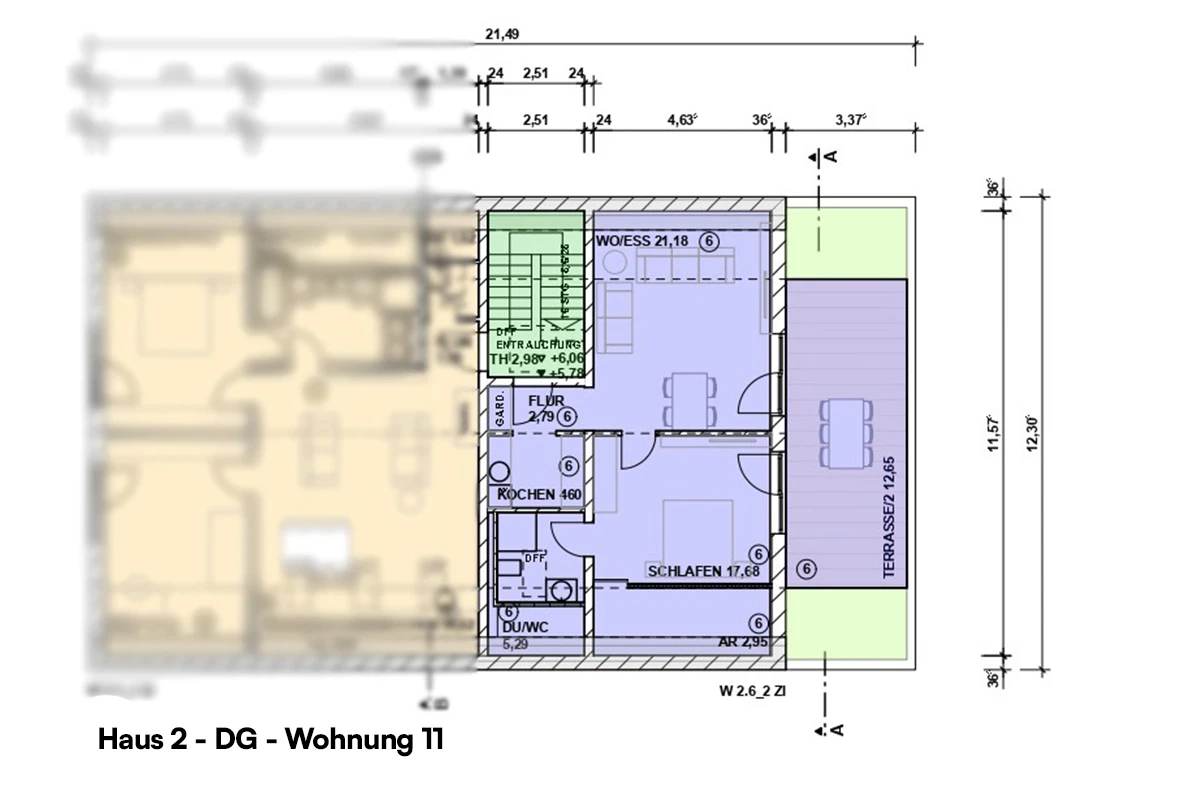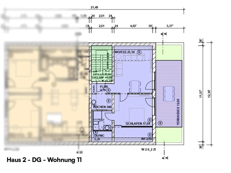 | Haus 2 – Wohnung Dachgeschoss 11 | Etage: 3 | Wohnfläche: ca. 67,14 m² (2 Zimmer) | Dachterrasse vorhanden: Ja | Stellplatztyp: Carport, Garage | frei! | |