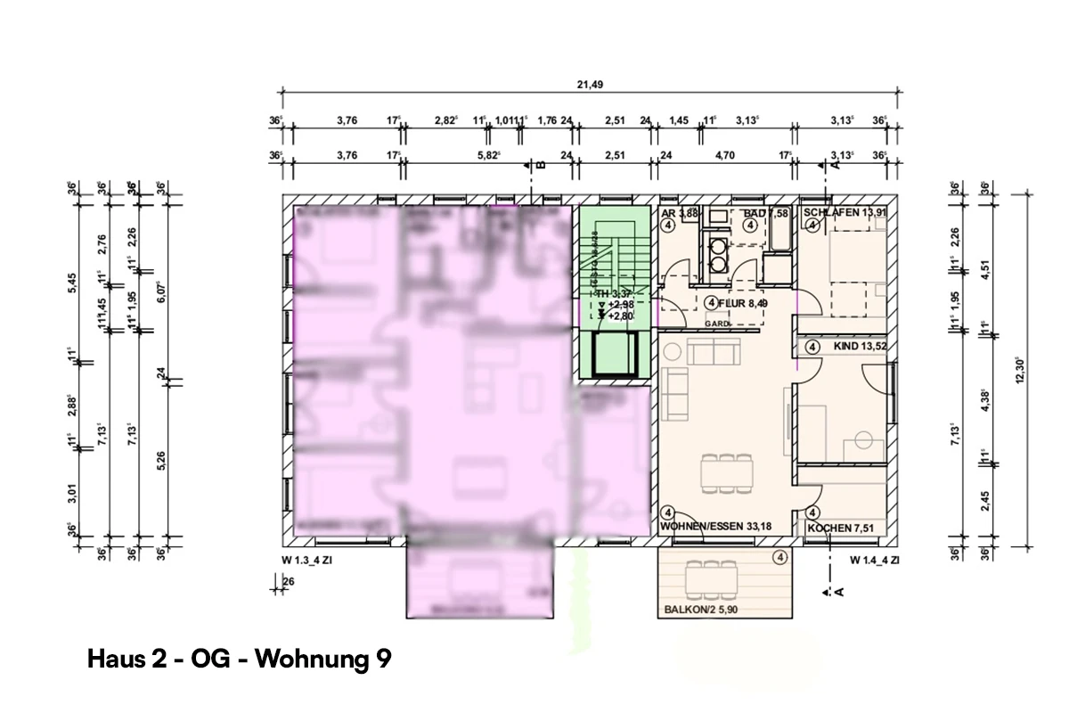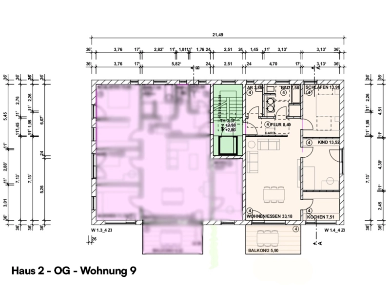 | Haus 2 – Wohung Obergeschoss 9 | Etage: 2 | Wohnfläche: ca. 93,97 m² (3 Zimmer) | Balkon vorhanden: Ja | Stellplatztyp: Carport, Aussenstellplatz | frei! | |